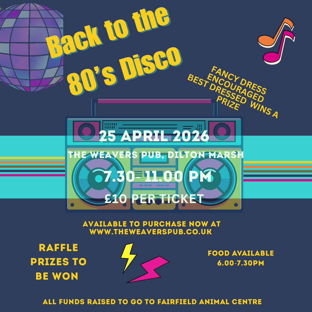Dig out your shoulder pads and leg warmers and dance the night away at our charity “Back to the 80’s” Disco taking place at The Weavers pub in Dilton Marsh. All funds raised to be donated to Fairfield Animal Centre.