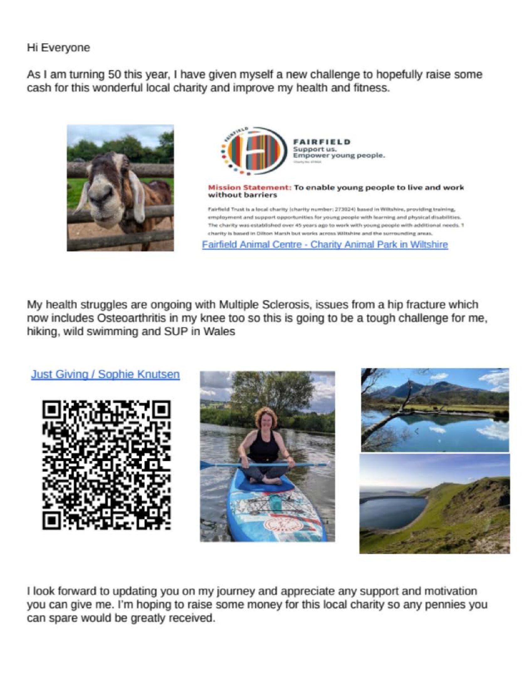Sophie is undertaking this journey while living with ongoing health challenges, including Multiple Sclerosis issues from a hip fracture, which has led to osteoarthritis in her knee. Despite this, she is determined to push herself and raise as much money as possible to support our work.